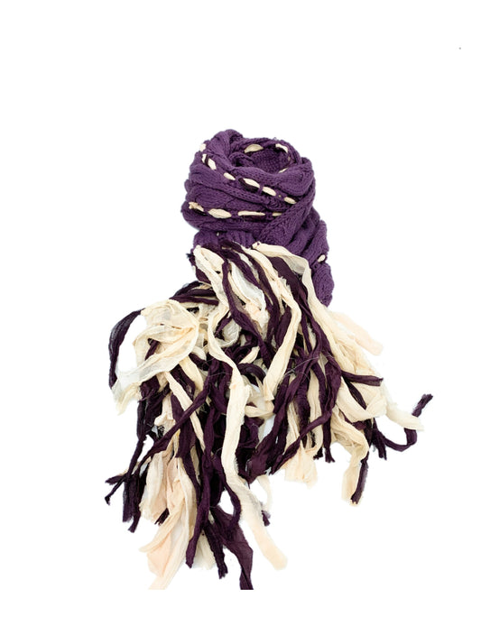 Upcycled Sari Ribbon Silk on Knitted Cable Scarf/ Boho Scarf